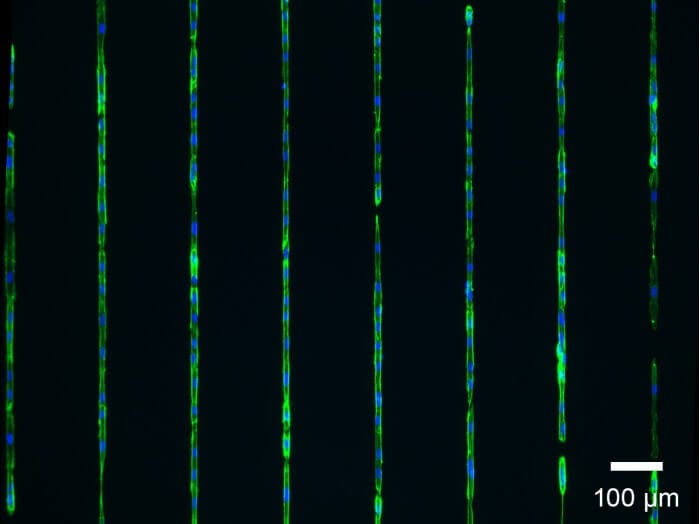 在20 µm lines上培養的人臍靜脈內皮細胞(HUVEC)。細胞接種前用Matrigel®進行預包被。孵育兩天后,進行固定和染色。藍色:細胞核(DAPI),綠色:F-肌動蛋白細胞骨架(Alexa 488偶聯物),10倍物鏡,寬場熒光成像。